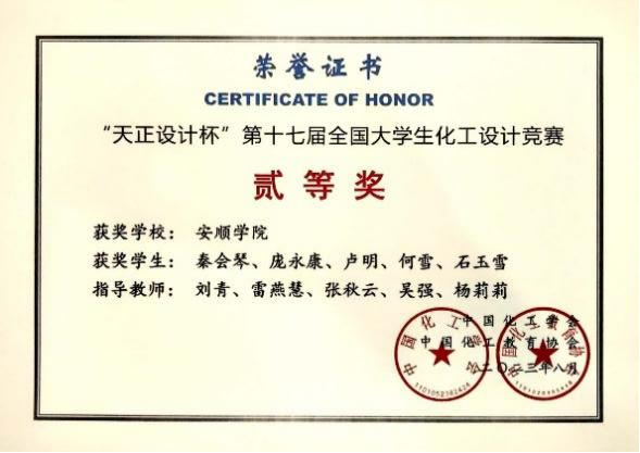 近日,全国大学生化工设计竞赛委员会传来喜讯,安顺学院2支代表队获得国家二等奖1项、国家三等奖1项,西南赛区一等奖1项、赛区二等奖1项的优异成绩。