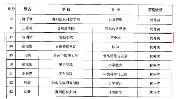 3月14日,首届贵州省大学生职业规划大赛省级决赛在贵州师范大学落下帷幕。3月28日,省教育厅正式公布大赛结果,安顺学院在此次大赛中获得多个奖项,其中艺术学院2021级环境设计专业学生杨家骏获成长赛道高教组银奖,人文学院2021级历史学专业学生杨明才获就业赛道高教组优秀奖,张秋老师团队获教学赛道优秀奖。