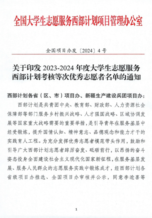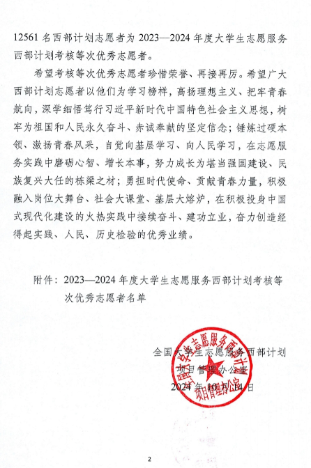 “到西部去,到基层去,到祖国最需要的地方去”的号召,如奋进号角,吹响青春征程。我校毕业生蒙雍荣获全国2023—2024年度西部计划志愿者优秀表彰。