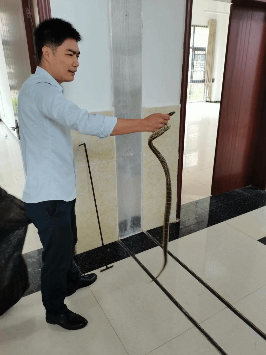 我处范晶、彭继军、陈虎虎老师一行立即赶到现场,发现一条一米多长的菜花蛇,躲藏在二楼一间教室里。由于教学楼学生多,存在安全隐患,我处工作人员迅速在周围设置警戒带,疏散师生,用钢叉按住蛇头,“快准狠”将其制服。最后在确认其非保护动物品种且没有毒性后,将该蛇带至校外湖边放生。