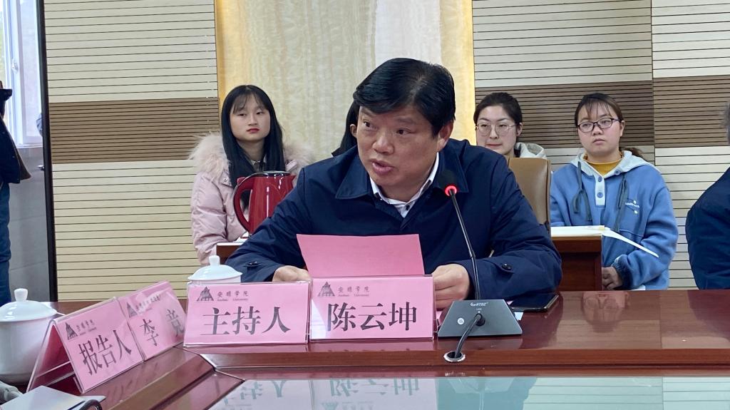 11月26日下午,厦门大学数学科学学院教授、博士生导师,贵州师范大学校长助理卢琳璋应邀在安顺学院特教大楼六楼会议室作题为“扇形矩阵的几个不等式”专题学术报告。安顺学院校长陈云坤主持报告会并致欢迎辞,安顺学院数学与计算机科学学院全体教师及部分学生代表参会。