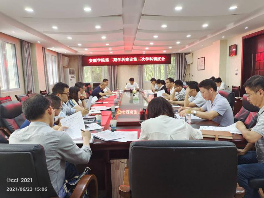 2021年6月23日下午,安顺学院第二期学科建设第三次学科调度会在学行政楼二楼召开。安顺学院校长陈云坤、党委副书记陶文彩、副校长郭本华、副校长张来出席会议,各学科方向带头人、发规处、人事处、计财处、招就处、科研处负责人及相关工作人员参加会议。会议由陈云坤主持。