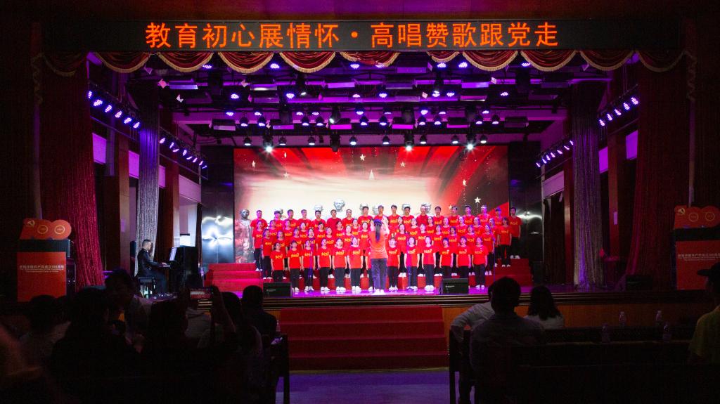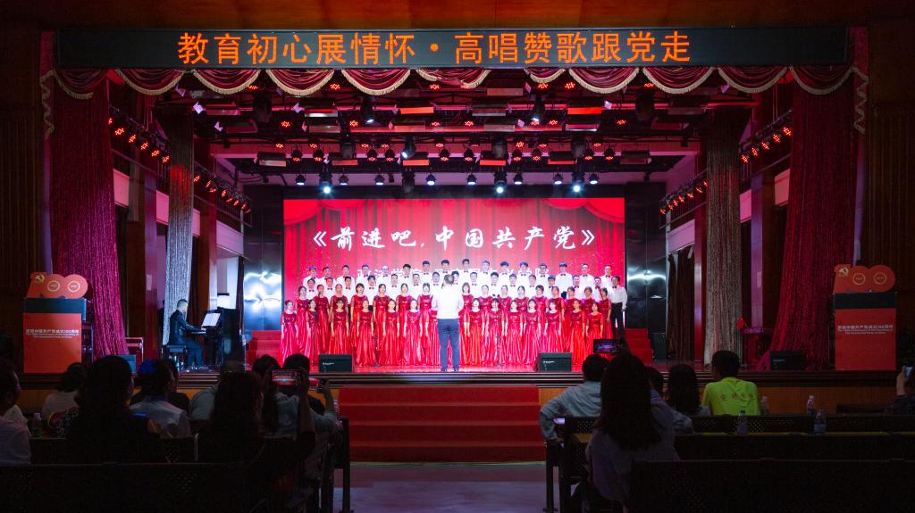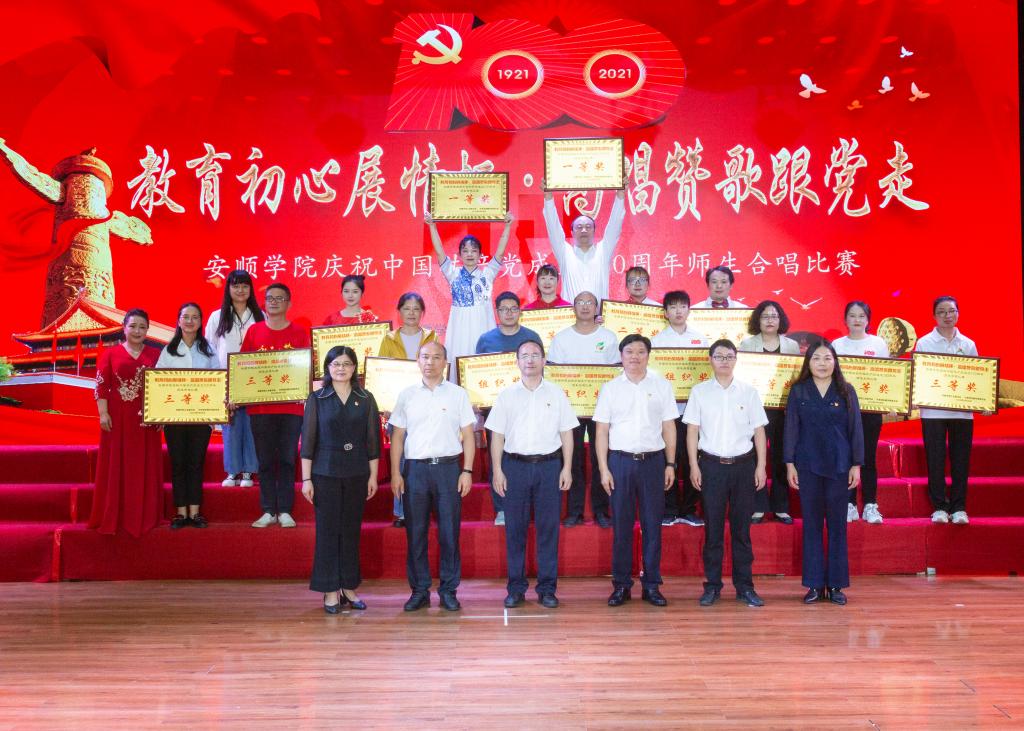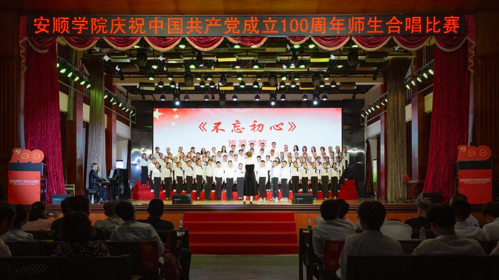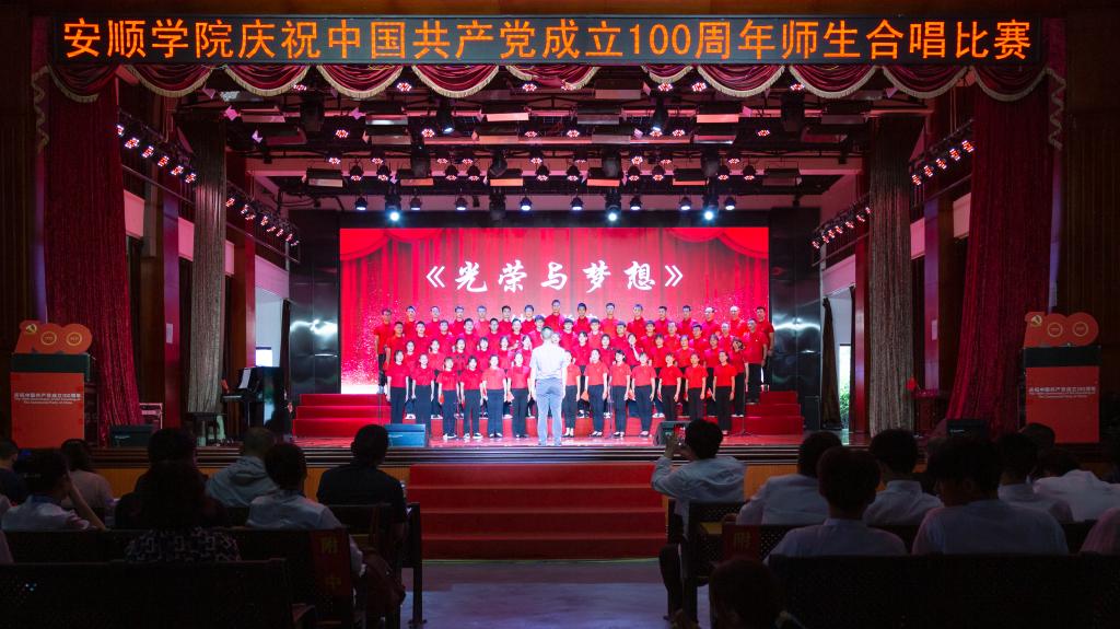 百年风雨兼程,百年卓越辉煌。为陶冶广大师生爱党、爱国、爱校的高尚情操,增强凝聚力,展现校园奋发进取的精神风貌,值此全国上下共同庆祝中国共产党百年华诞之际,6月28日下午,安顺学院在大礼堂隆重举办“教育初心展情怀•高唱赞歌跟党走”庆祝中国共产党成立100周年师生红歌合唱比赛。安顺学院党委书记罗荣彬,党委副书记、校长陈云坤,党委委员、副校长郭本华,党委委员、纪委书记蔡红英,党委委员、副校长韦英,党委委员、副校长 张来,党委委员、党委宣传部部长殷红敏,党委委员、教务处处长杜志明以及各职能部门、各二级学院负责人出席比赛。由全校各分工会组成的16支教职工代表队参加比赛。安顺学院艺术学院教授、中国音乐家协会会员、贵州省音乐家协会会员熊黏,中国合唱协会会员、贵州音乐教育研究会理事、安顺市音乐教育研究会副会长段剑,安顺市教育科学研究所音乐教研员、贵州省教育学会理事、安顺市音乐教育专业委员会副理事长、安顺合唱协会副会长陈洪刚,安顺市第二高级中学音乐高级教师、市级名师工作室主持人、市教育学会音乐教育分会副会长吴玛丽,安顺市第三高级中学音乐一级教师、贵州省合唱协会会员、安顺合唱协会理事会理事陈兴余担任比赛评委。