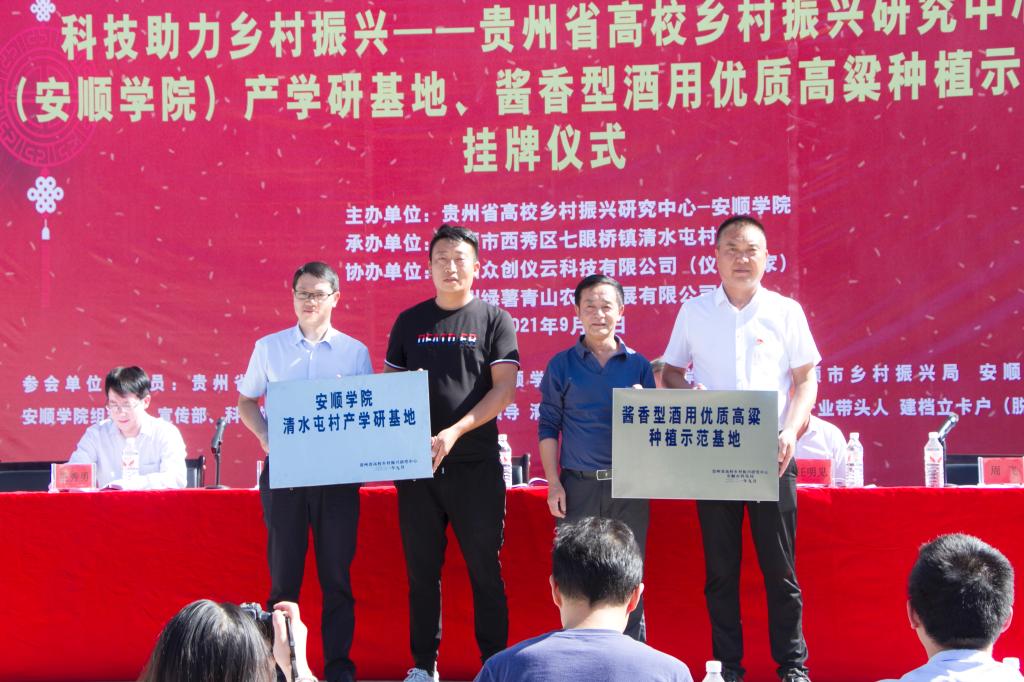 挂牌仪式上,安顺学院副校长张来、安顺市科技局副局长涂江顺为“安顺学院清水屯村产学研基地”、“酱香型酒用优质高粱种植示范基地”授牌。