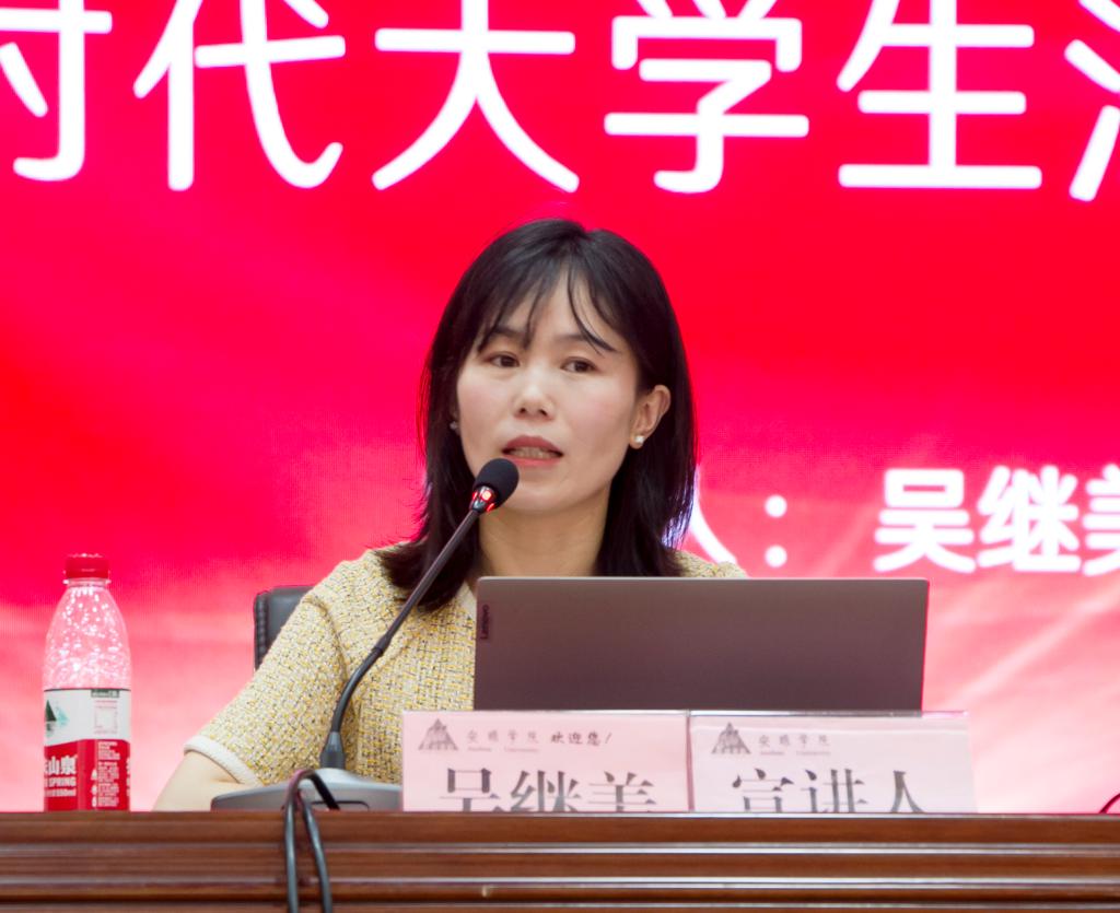 吴继美从习近平法治思想的形成及确立、习近平法治思想的核心要义、新时代推动法治进程“2021十大案件”、做尊法守法的新时代大学生四个部分,将理论知识结合实际案例,对习近平法治思想的核心要义与精神内涵进行了深入讲解和系统解读。最后,她鼓励大家要学深悟透习近平法治思想,在今后的学习与工作中德法兼修、明法笃行,在中华民族伟大复兴的中国梦的奋斗中书写出绚丽的人生华章。报告内容丰富,形式多样,意义重大,与会师生收获满满。