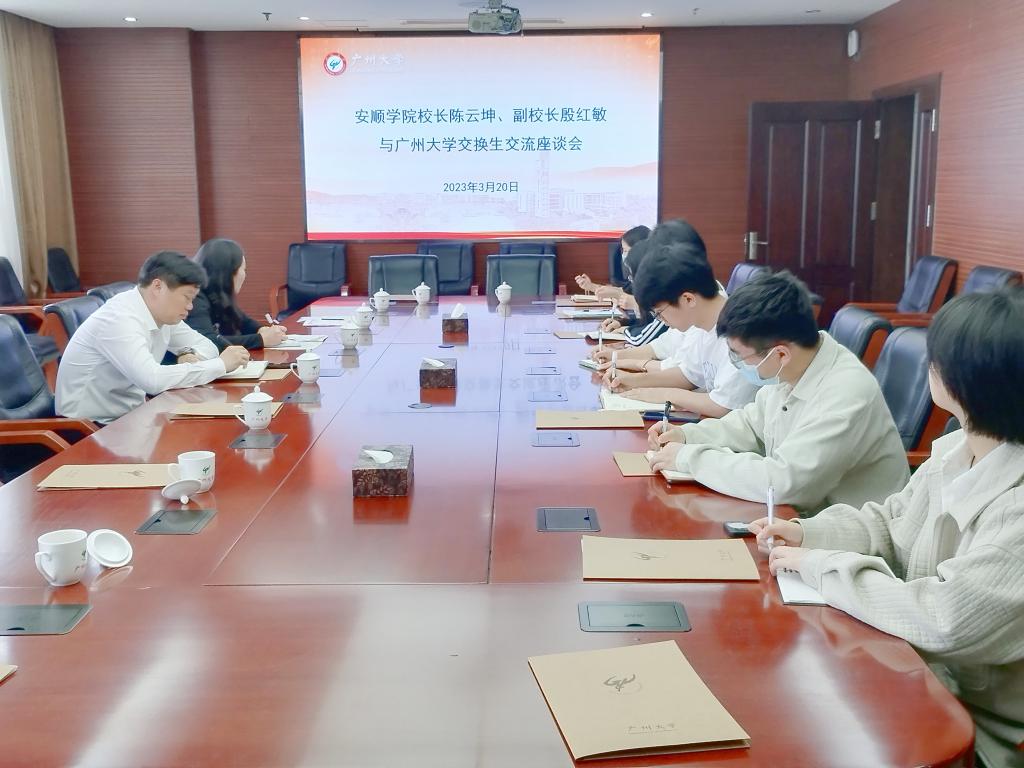 在访问期间,陈云坤、殷红敏与我校在广州大学交换生进行了座谈交流。交换生分别就在广州大学交换学习期间校风学风、教学方式方法、考研情况、就业规划与指导、校园文化建设、校园基础设施建设等方面的感受进行了介绍。殷红敏强调,同学们一定要珍惜来之不易的机会,牢牢遵守校规校纪、要注意校园安全问题、相互之间要团结互助,通过不断学习提升自我,学有所成。陈云坤叮嘱,同学们要紧紧把握住机会,做好人生规划、职业规划,争做可造之才、成为有用之才。