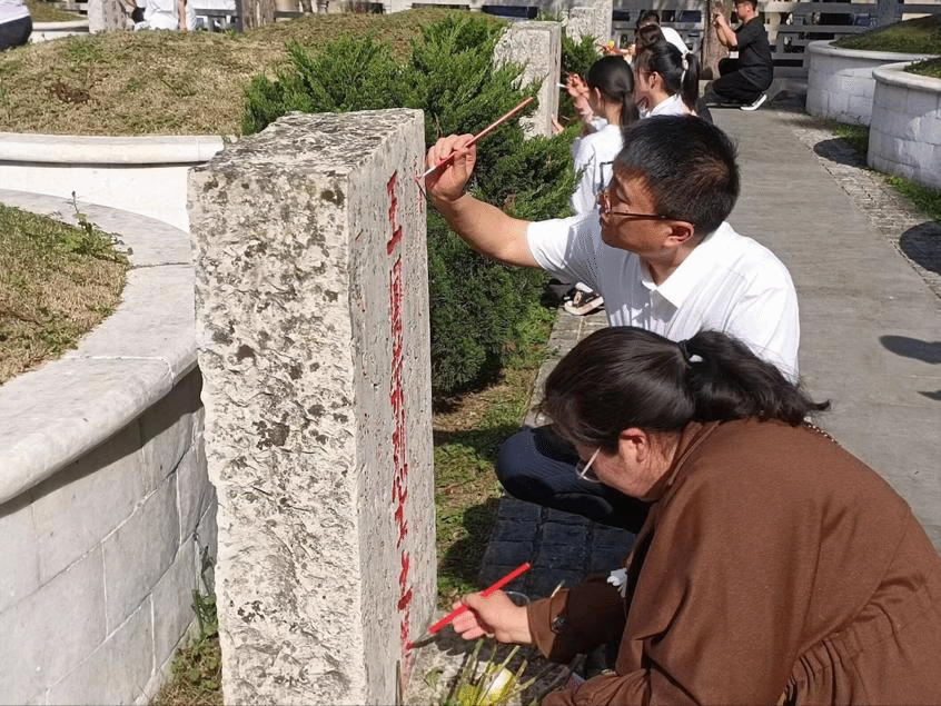 仪式结束后,师生们来到英雄们的长眠之地,为长眠于此的烈士清洗墓碑、添红描金。多年的日晒雨淋,烈士纪念碑上的殷红逐渐黯淡。师生们手握一支支画笔,一笔一划认真地在革命烈士纪念碑上描摹着。