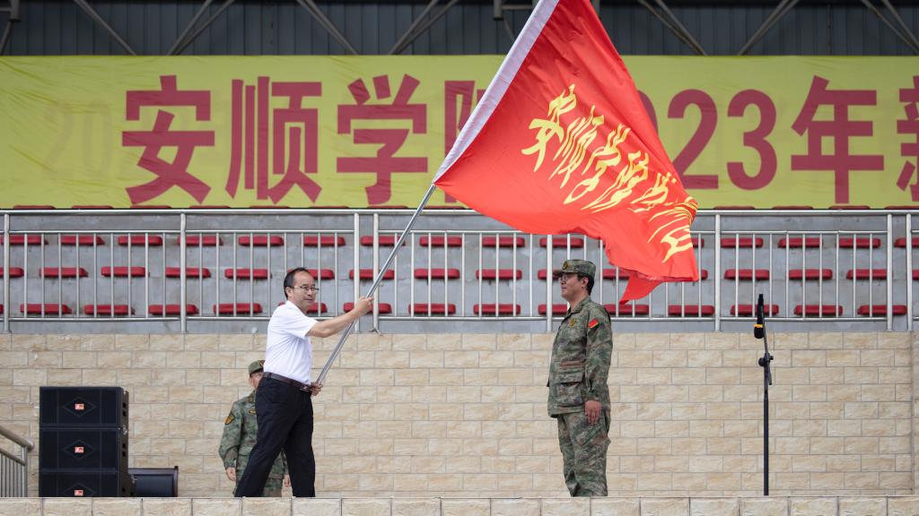 安顺学院党委书记罗荣彬为2023级学生军训团授旗