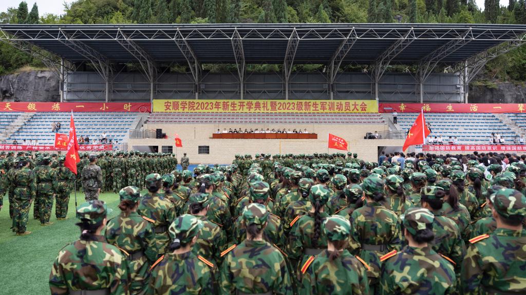 2023年9月12日上午,安顺学院2023级新生开学典礼暨2023级学生军训动员大会在综合运动场隆重举行。安顺学院党政班子成员,各学院党政负责人,2023级学生军训团团部主要干部,安顺学院—安顺职院联合办学点带队负责人,全体军训学员与新生班主任参加大会。大会分为两个阶段进行,开学典礼由安顺学院党委书记罗荣彬主持,军训动员大会由安顺学院党委副书记陶文彩主持。