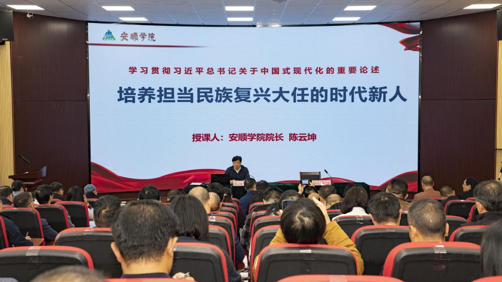 11月7日,安顺学院党委副书记、校长、安顺学院学习贯彻习近平新时代中国特色社会主义思想主题教育领导小组副组长陈云坤,以“学习贯彻习近平总书记关于中国式现代化的重要论述 培养担当民族复兴大任的时代新人”为题,为学校全体处级干部和分管职能部门、学院的全体教师党员讲专题党课。学校党委副书记陶文彩主持会议。