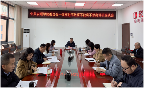 12月8日,安顺学院召开“中共安顺学院委员会一体推进不敢腐、不能腐、不想腐”调研座谈会。安顺学院党委组织部、党委宣传部、纪委、审计处、国资处等部门负责人及经管学院、马克思主义学院等基层党委书记参加调研座谈会。会议由安顺学院党委书记罗荣彬主持。