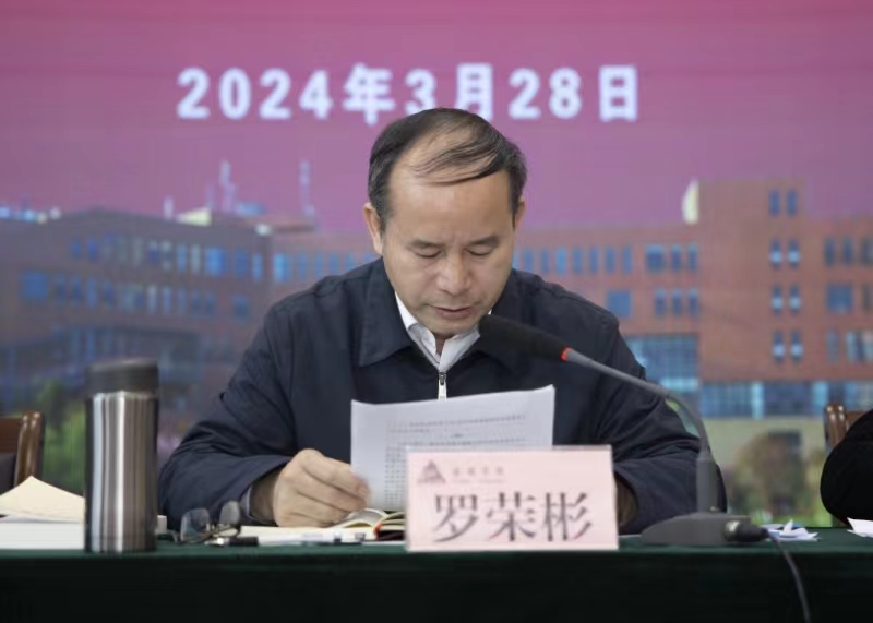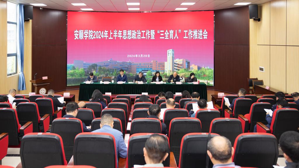 2024年3月28日下午,安顺学院在安道楼阶梯会议室召开2024年上半年思想政治工作暨“三全育人”工作推进会,坚持为党育人、为国育才的初心使命,落实立德树人根本任务。安顺学院党委书记罗荣彬、校长曾丽、党委副书记陶文彩,党委委员、副校长郭本华,党委委员、纪委书记、监察专员蔡红英,党委委员、副校长韦英,副校长张来,各基层党委书记,各职能部门负责人参加会议。会议由陶文彩主持,罗荣彬作讲话。