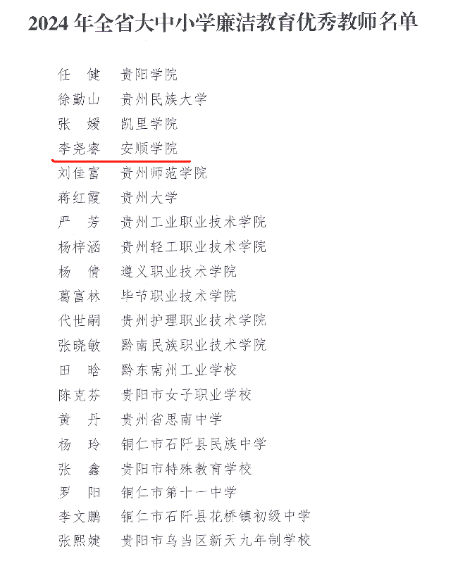 近日,贵州省教育厅办公室发布了《省教育厅办公室关于表扬2024年全省廉洁教育优秀教师的通知》文件,安顺学院旅游学院教师李尧睿荣获2024年全省大中小学廉洁教育优秀教师表彰。