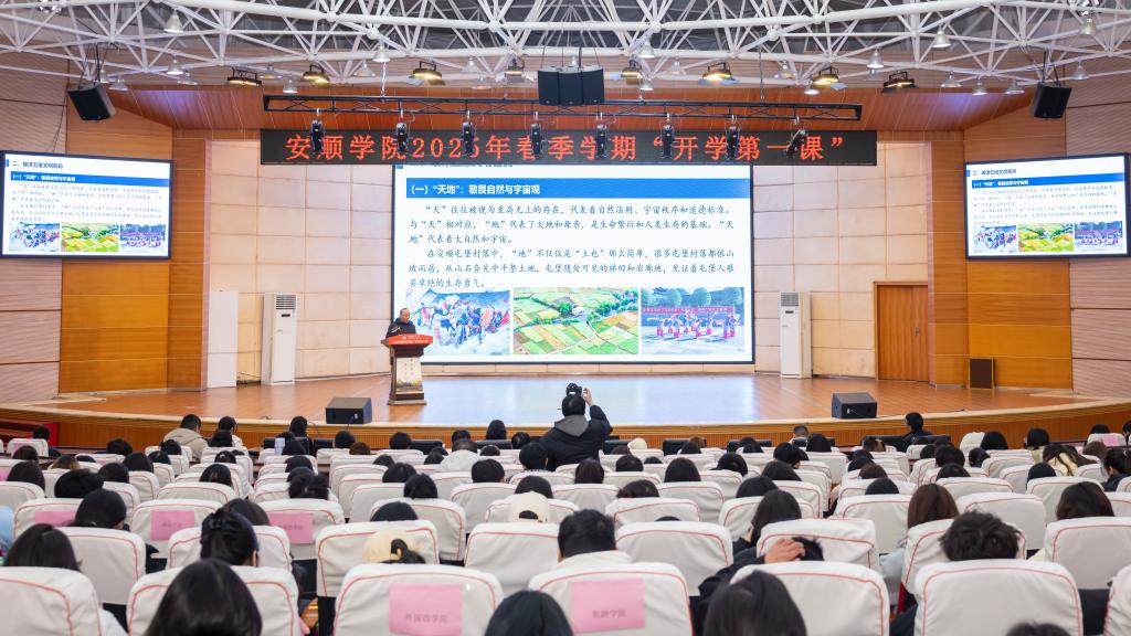 2025年3月10日下午,新学期伊始,安顺学院党委书记程绪权、校长曾丽为全校近700名师生代表讲授2025年春季学期“开学第一课”。这场精心打造的 “开学第一课”,别开生面地以极具地域特色的屯堡文化为主题,以屯堡地戏、花灯等串烧的形式,将传统文化传承与家国情怀教育紧密融合,为全校师生呈上了一场意义非凡的文化盛宴,奏响了一曲激昂的家国赞歌。学术报告厅座无虚席,气氛热烈,掌声阵阵。