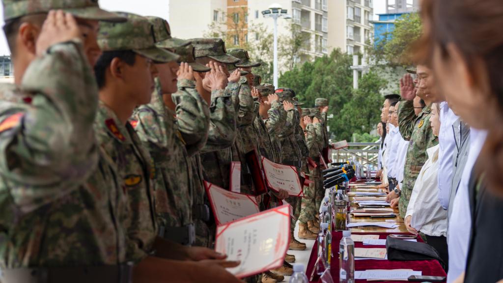 主席台第一排领导分别为受表彰的优秀教官、先进连队代表,以及标兵学员、优秀学员、优秀通讯学员代表颁发证书与奖牌