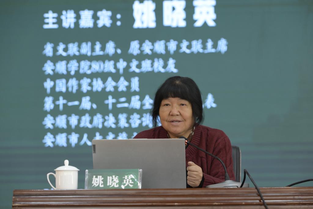 2025年11月28日上午,省文联副主席、原安顺市文联主席,安顺学院80级中文班校友,中国作家协会会员,第十一届、十二届全国人大代表,安顺市政府决策咨询专家,安顺市人大文旅立法咨询专家姚晓英重返母校,以“在黔之腹行走 为认知停留——安顺文化旅游的融合旅途的实践与期许”为题在安顺学院学术报告厅开展讲座,分享安顺文化旅游融合实践,推动地方文化资源创新,提升师生人文素养,弘扬文旅跨界思维。安顺学院党委书记程绪权,校长曾丽,副校长张来,副厅级干部殷红敏,党委常委、副校长杜志明,党委常委、副校长孙向阳,党委常委、党委宣传部部长伍微微,全校师生代表近600人聆听讲座。讲座由杜志明主持。