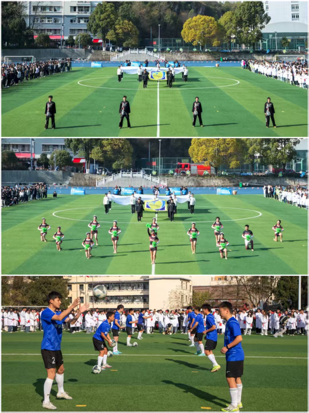 宣誓环节后,精彩纷呈的文体表演轮番上演:学校健身气功队展现传统文化与体育力量的融合,啦啦操队员以活力舞姿点燃现场氛围,足球技能展示彰显学子专业素养,歌曲《铿锵玫瑰》则以激昂旋律传递永不言弃的精神,赢得全场阵阵掌声,充分展现了“体育+文化”的融合魅力。