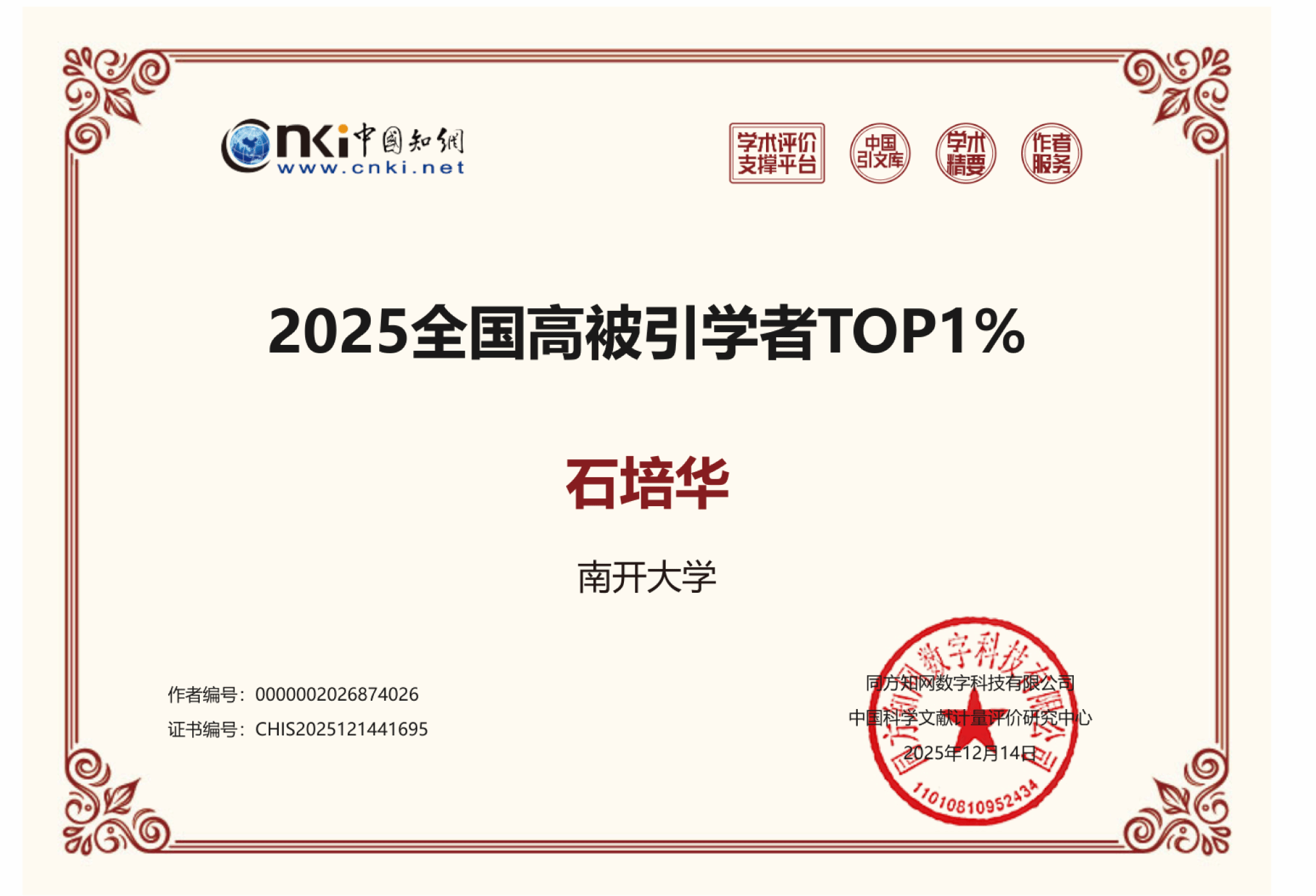 喜报 | 石培华教授连续两年入选中国知网高被引学者TOP1%