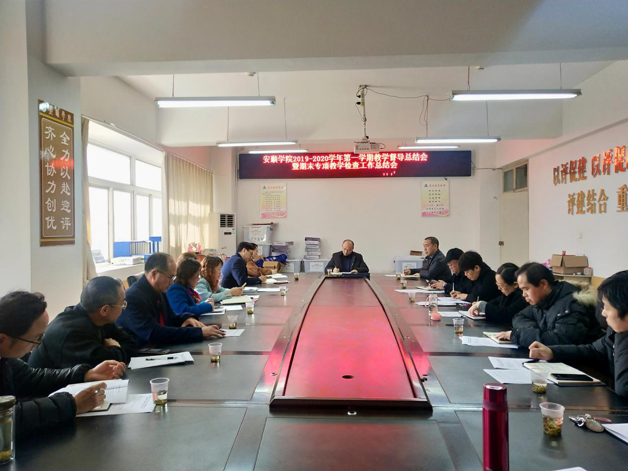 2020年1月9日下午,安顺学院2019-2020学年第一学期教学督导工作总结会暨期末教学专项检查工作总结会在教务处四楼会议室召开。学校教学督导成员、评建办、教务处相关人员参会。本次会议由副校长郭本华主持。