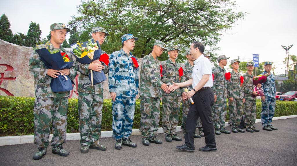 晨曦已微露,男儿好出征。9月14日早7时,我校2019年第二批起运新征大学生士兵在学校大门内校名墙前完成集合,准备踏上赶赴军营的行程。入伍同学的亲人、所在学院党政负责人和辅导员班主任以及部分同学,学校武装部和宣传部有关同志参加欢送。