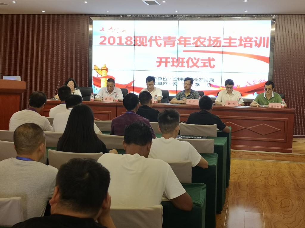 2019年8月26日上午,2018年度现代青年农场主培训在安顺学院开班。安顺市农业农村局党组成员、市农业科学院党委书记、安顺学院农学院院长张鹏,市农业广播电视学校校长罗军英,安顺学院农学院党委书记喻辉、科研处处长张来、农学院副书记张玉波等相关负责人、培训班班主任及来自安顺市各县区的共计60名学员参加了开班仪式。