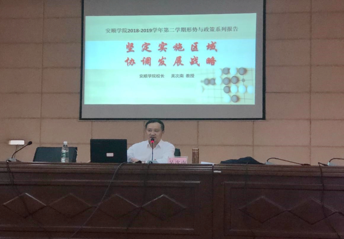 为进一步强化大学生形势与政策教育,推进党情国情世情宣传教育,2019年5月14日晚安顺学院2018-2019第二学期形势政策暨党情国情世情系列报告会在学术报告厅举行。安顺学院校长吴次南应邀为第27期党校近600名同学作了题为“坚定实施区域协调发展战略”的报告。