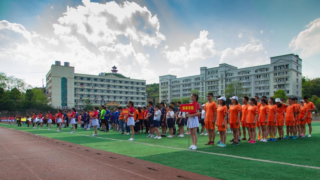 4月10日下午,安顺学院第五届大学生体育文化节足球比赛开幕式在学校足球场举行。安顺学院学生处副处长张明莉、特教学院党委副书记王玉、体育学院党委副书记林金茹、各二级学院团总支书记,以及各参赛队领队、教练员、运动员和裁判员参加开幕式。