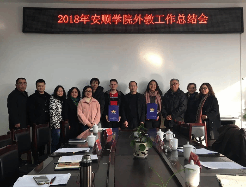 12月21日下午,安顺学院2018年外教工作总结会在外国语学院会议室召开。安顺学院党委书记罗荣彬、副校长令狐荣涛,外国语学院相关负责人,外籍教师及其合作教师,以及对外交流与合作处全体人员参加会议。