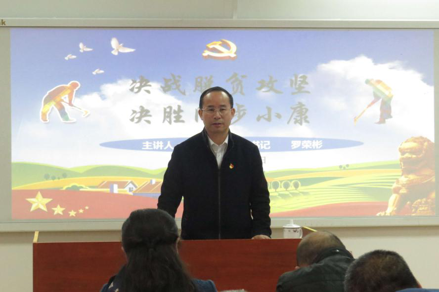 课上,罗荣彬书记以“决战脱贫攻坚·决胜同步小康”为题,从三个方面23个点入手,详细介绍了我校近年来在脱贫攻坚实践工作的情况与安排部署情况,并指出我校在脱贫攻坚工作中要“主动融入、主动服务”,扎实推进脱贫攻坚工作,并以此带到学校各项事业的发展。罗荣彬书记鼓励师生积极思考扶贫方式与扶贫项目,以实际行动支持学校的扶贫工作。