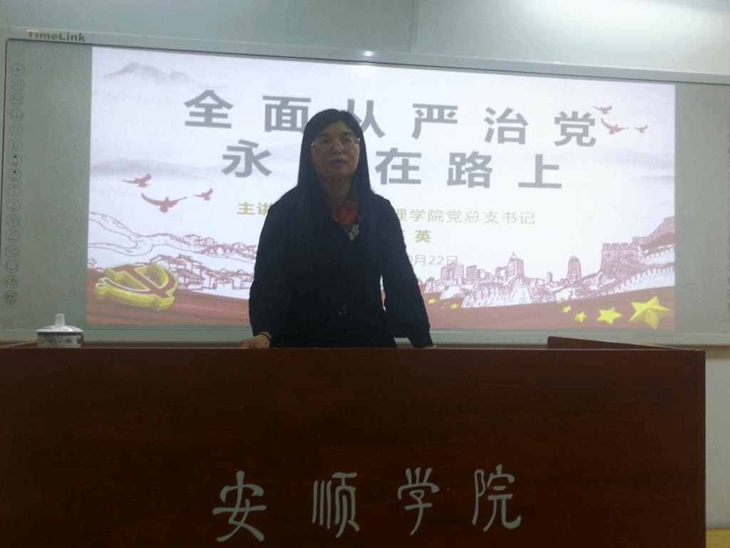 经济与管理学院党总支书记韦英结合经管学院的实际工作,以“全面从严治党永远在路上”为题,给大家上党课。
