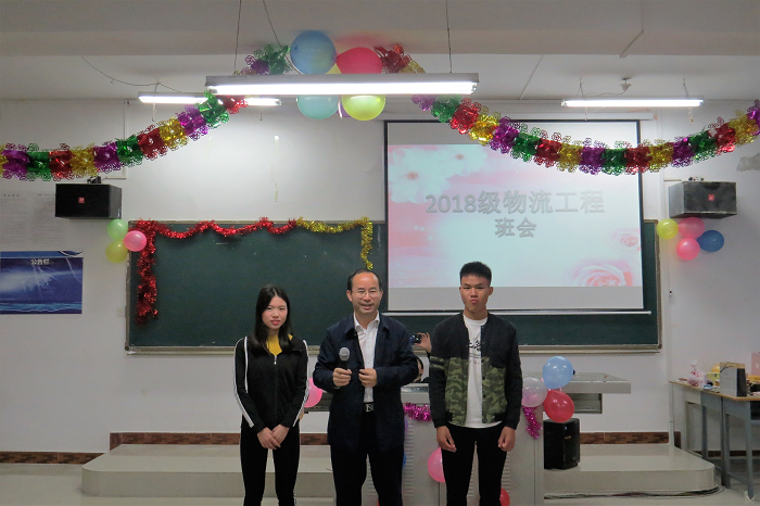 安顺学院党委书记罗荣彬(中)作为班级导师参加经管学院物流工程班班会
