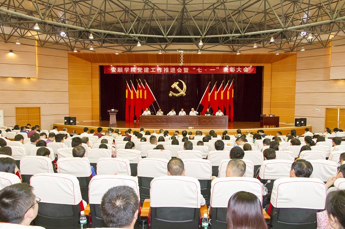 2018年6月22日下午,安顺学院党建工作推进会暨“七·一”表彰大会在学术报告厅隆重举行。安顺学院党委书记罗荣彬,党委副书记、院长刘雷,党委副书记陶文彩,党委委员、副院长熊国敏,党委委员、副院长王芳恒,党委委员、纪委书记马力,党委委员、副院长郭本华出席大会。全校副科级以上干部,机关党总支全体党员、受表彰的党组织和党员代表参加会议。会议由刘雷院长主持。