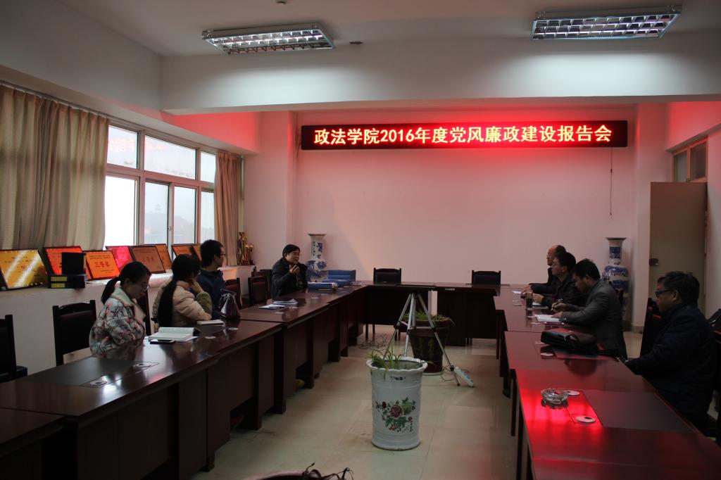 政法学院院长徐忠代表学院从加强领导,把党风廉政建设落到实处;抓好纠正行业不正之风;下一步将继续做好治本工作,从源头预防和解决腐败问题三个方面,对2016年度政法学院党风廉政建设主体责任落实情况进行汇报。