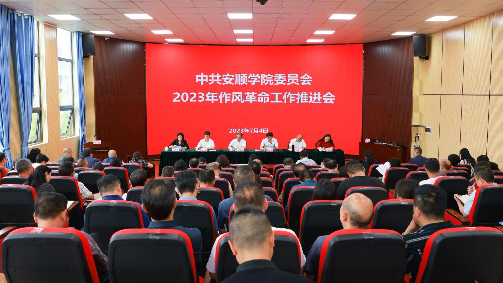 2023年7月4日上午,安顺学院召开作风革命工作推进会议。安顺学院党委书记罗荣彬,党委副书记陶文彩,党委委员、副校长郭本华,党委委员、纪委书记、监察专员蔡红英,党委委员、副校长殷红敏出席会议,全校正副处级干部参加会议。会议由安顺学院党委副书记、校长陈云坤主持。会上,蔡红英通报了全校作风突出问题,宣传部、人事处与体育学院分别作了交流发言和表态发言。