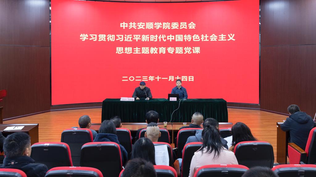 11月14日,安顺学院党委副书记、安顺学院学习贯彻习近平新时代中国特色社会主义思想主题教育领导小组办公室主任陶文彩,以“深入学习贯彻习近平总书记关于树立和践行正确政绩观的重要论述  奋力推动安顺学院高质量发展”为题,为学校分管学院、职能部门以及所在支部的全体教师党员作专题党课。安顺学院党委委员、党委组织部部长何朝越主持会议。