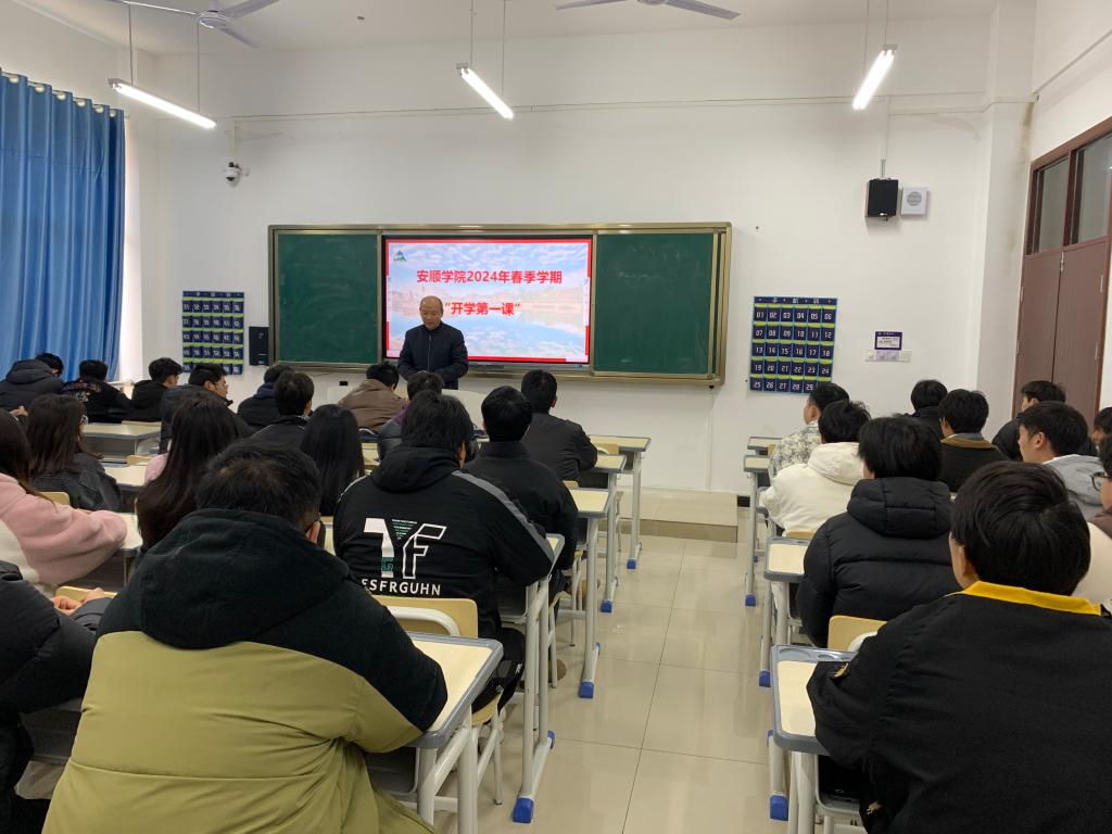 2024年3月1日下午,安顺学院党委委员、副校长郭本华在顺理楼2-32教室为2021级电子信息工程班讲授2024年春季学期“开学第一课”思政课。