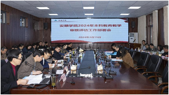 2024年3月15日上午,在学校安道楼第一会议室召开了安顺学院2024年本科教育教学审核评估工作部署会。在家校领导,二级学院书记和院长,各职能部门负责人,教务处科级以上干部及质评中心全体人员参加会议,会议由安顺学院校长曾丽主持。
