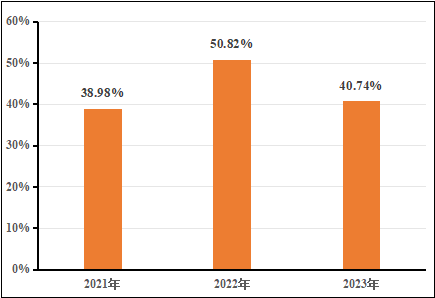 师范专业学生近三年过级率情况如下图所示。师范专业教师资格证过级率逐年提升,2022年达到50%。