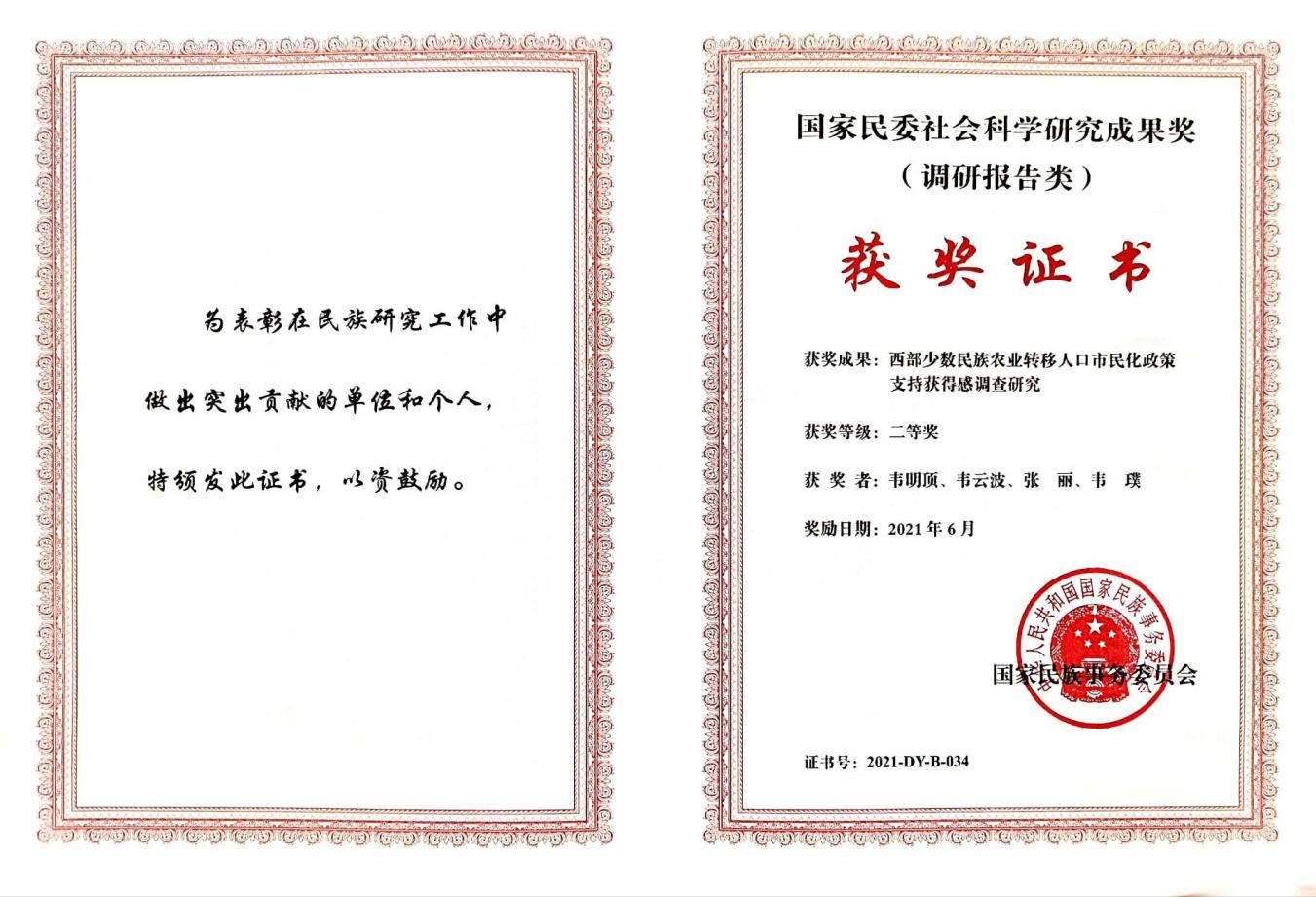 国家民委社会科学研究成果奖(调研报告类)获奖证书