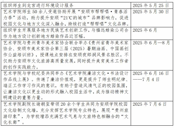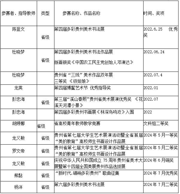 近五年来,教师美术作品参加省级以上入展、获奖30余件,美术作品被省级以上重要美术馆收藏9件;学生参加省级以上各类技能大赛获一、二、三等奖60余项;参与或举办省、市、校助力乡村振兴等各类展览12场次。2024年,全省青教赛获本科文科组第二名荣获二等奖,全省大学生挑战杯比赛获一、二等奖各1项,此两项为安顺学院参加比赛以来的最好成绩;2024年度互联网+大学生创新创业大赛中,安顺学院获7个银奖,其中,艺术学院获银奖3个;参与或组织省、市、校大型文艺演出13场次,开展艺术类培训8场次,培训人员400余人。