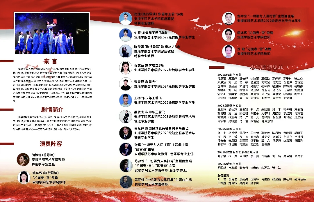 (二)创新党建与育人模式:践行“党建+艺术”育人模式,打造大型原创红色舞台剧《王若飞》,每年近100名师生参与创作与表演。该剧2023年被列为贵州省教育厅“高校原创精品”培育项目,截至2024年已演出30余场,累计观演人数达20000余人次,社会反响强烈。