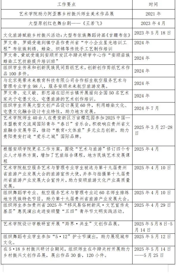 艺术学院“十四五”规划中提出打造特色优势专业群。立足安顺和黔中特有的资源禀赋,围绕“全域旅游”和乡村振兴,打造好专业群,彰显特色,突出优势,走出“人无我有、人有我优”的差异化发展之路,把民间文化艺术进方案、进教材、进课堂、进校园。目前艺术学院已经在课程开设、培养方案等方面,注重把地方文化融入教学,注重产学研合作模式,和相关企业及文化机构认真开展培养培训,多次开展“锦绣计划”培养,为安顺的小企业、镇宁石头寨等培养地方手工人才,让传统文化与现代艺术相结合,保护和发展地方文化。先后组织编写《传统手工艺乡村振兴教材——蜡染》《蜡染工艺美术实用教程》教材,为宣传弘扬地方文化,做好系统性收集、整理工作。