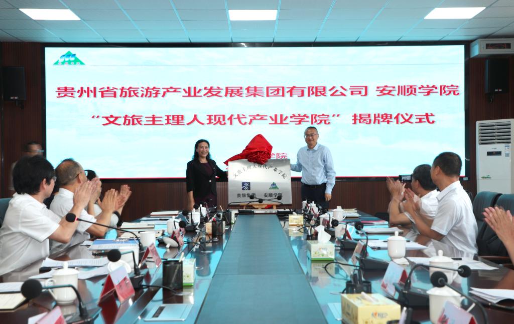 贵州省旅游产业发展集团有限公司党委书记、董事长郭伟谊和安顺学院校长曾丽为“文旅主理人现代产业学院”揭牌