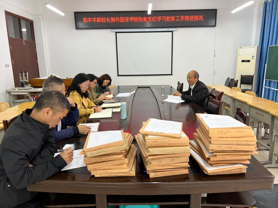 郭本华在听取汇报和查看外国语学院党纪学习教育资料后,对外国语学院党纪学习教育给予了充分肯定,他指出,全校开展党纪学习教育以来,各基层党组织积极响应、迅速行动,贯彻落实党中央、省委、市委的部署要求,为学校党纪学习教育营造了良好氛围和实现了良好开局。并对外国语学院下一步党纪学习教育提出了三点要求:一是党委班子成员要进一步提高政治站位,高效推动党纪学习教育,坚持先学一步、学深一层,自觉对照《条例》各项规定,把自己摆进去、把职责摆进去、把工作摆进去。在学纪上立标杆、作表率,把党纪学习教育与当前外国语学院的中心工作紧密结合,做到学习上一体安排、谋划上一体部署、落实上一体推进,帮助党员干部深刻理解、准确把握其精神实质,真正做到学懂弄通、知行合一。二是中心组要认真学习习近平总书记关于党纪党规的重要论述和习近平总书记关于党纪学习教育的重要指示精神,对《中国共产党纪律处分条例》逐章逐条学、联系实际学,做到学深学透学到位,准确掌握《条例》主旨要义和规定要求,进一步严明政治纪律和政治规矩,把维护党的政治纪律放在首位,带动各项纪律全面从严,确保全体党员在思想上、政治上、行动上同党中央保持高度一致。三是要加强督促指导,指导教师党支部和学生党支部通过“三会一课”“主题党日”等形式高质量精心组织开展好党纪学习教育,引导全体党员干部逐章逐条学,做到学纪、知纪、明纪、守纪,把党章党规党纪刻印在心上,自觉形成尊崇党章、遵守党纪的良好习惯。(文/图:外国语学院  流江涛/黄友丽)