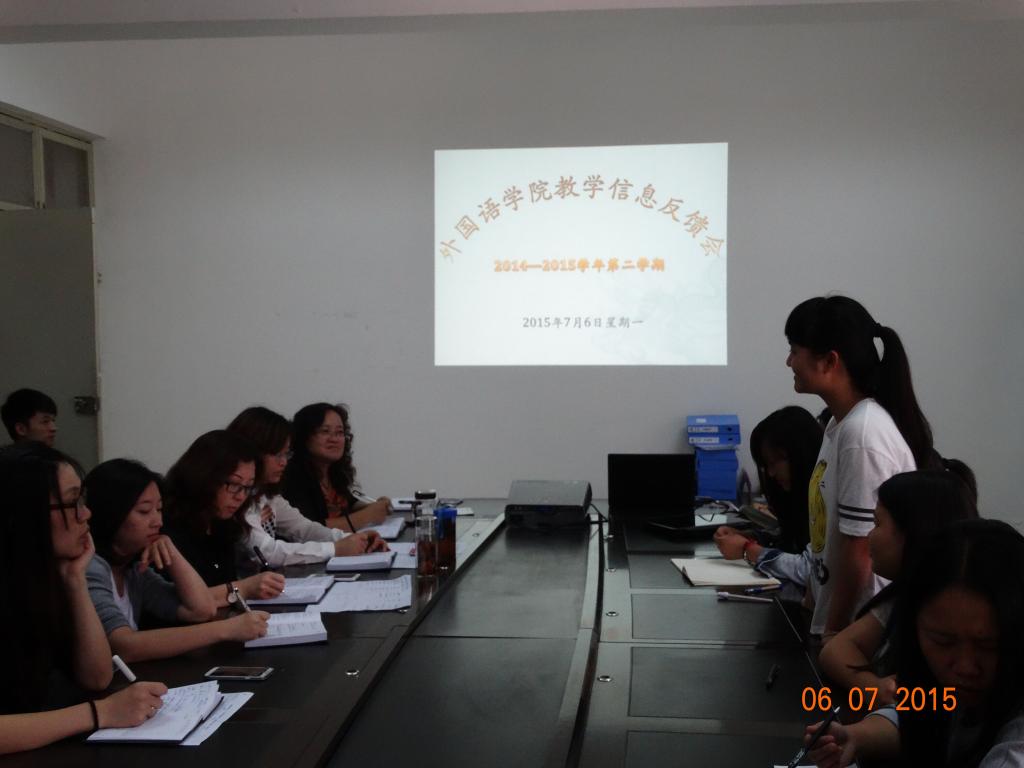 2015年7月6日上午,外国语学院在新教学楼七楼会议室召开学院教学信息反馈会。外国语学院院长蒋燕,分管英语专业日常教学的副院长曾沉,分管日语专业日常教学的副院长刘碧芬,英、日语专业教研室主任、教师代表、学院各年级学生代表参加了反馈会。反馈会由曾沉副院长主持。